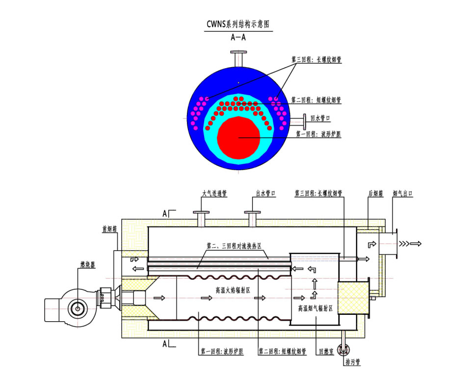 CWNS系列全自動(dòng)燃油(氣)臥式熱水鍋爐(實(shí)用新型專利),采用臥式三回程濕背結(jié)構(gòu),改善鍋爐運(yùn)行環(huán)境,提高鍋爐效率和使用壽命;全部煙氣通道置于水中,尾部配有余熱水箱及完善的保溫外包設(shè)計(jì),煙箱密封采用迷宮式結(jié)構(gòu),避免了煙箱漏煙現(xiàn)象。鍋爐熱效率高達(dá)90%以上,采用有良好膨脹性能的波紋爐膽與錐形爐膽的組合爐膽,爐膽尺寸與火焰相吻合,煙氣流通面積以次減小,使煙氣等速流動(dòng),高溫?zé)煔庠跔t內(nèi)的熱交換時(shí)間,達(dá)到*佳傳熱效果;采用與鍋爐有效匹配的高性能燃燒機(jī),進(jìn)行自動(dòng)調(diào)節(jié),使燃燒充分,節(jié)省燃料,降低污染;采用高保溫性能的超細(xì)玻璃棉,散熱損失更小;采用智能化節(jié)能控制系統(tǒng),對(duì)鍋爐及供水、供暖、自控水溫系統(tǒng)進(jìn)行控制,結(jié)合不同負(fù)荷調(diào)節(jié)燃料供給,更加節(jié)能。安裝方式為整體快裝鍋爐,振動(dòng)小,對(duì)地基無特殊要求,不需地腳螺栓固定,安裝簡單易行。 采用活動(dòng)爐頭結(jié)構(gòu),可匹配各種燃燒器,更換爐頭,維修爐體方便快捷。 前、后煙箱采用活動(dòng)可拆結(jié)構(gòu),可方便地對(duì)鍋爐內(nèi)部進(jìn)行檢查、維護(hù)、保養(yǎng),簡單、便捷,產(chǎn)品設(shè)計(jì)新穎、結(jié)構(gòu)合理,工藝性能良好,使本產(chǎn)品具有不同凡響的優(yōu)異品質(zhì),是新開發(fā)的新款產(chǎn)品。